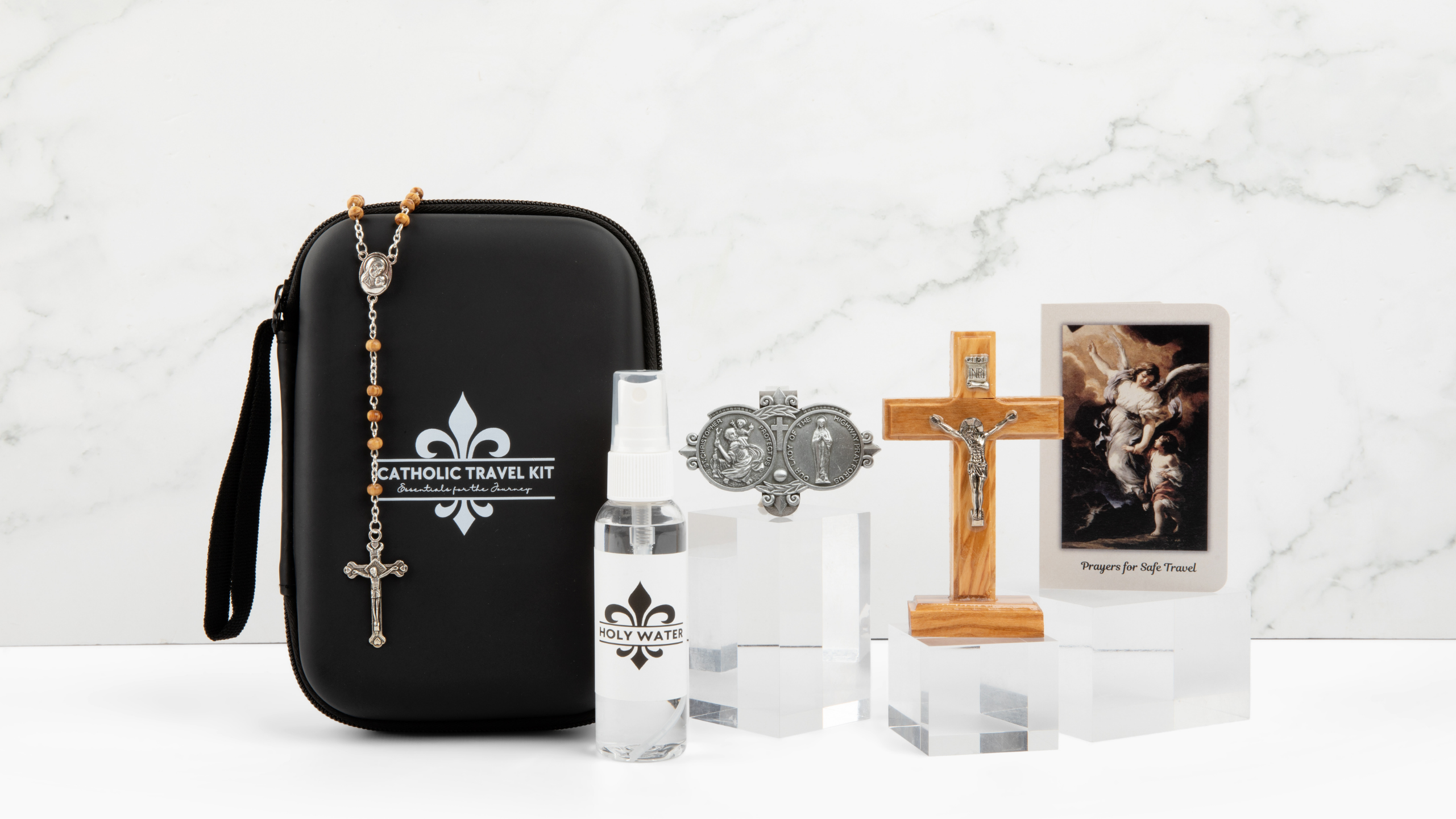 Whether you're jetting off to Rome or just heading to work, the **Catholic Travel Kit** is your portable sanctuary. Thoughtfully curated with essentials like a standing crucifix, travel rosary, holy water bottle, and travel prayer card, this kit helps you stay spiritually grounded wherever life takes you. Designed for convenience, reverence and beauty, it’s the perfect companion for pilgrims, students, missionaries, and anyone who wants to bring a little sacredness to their suitcase.
